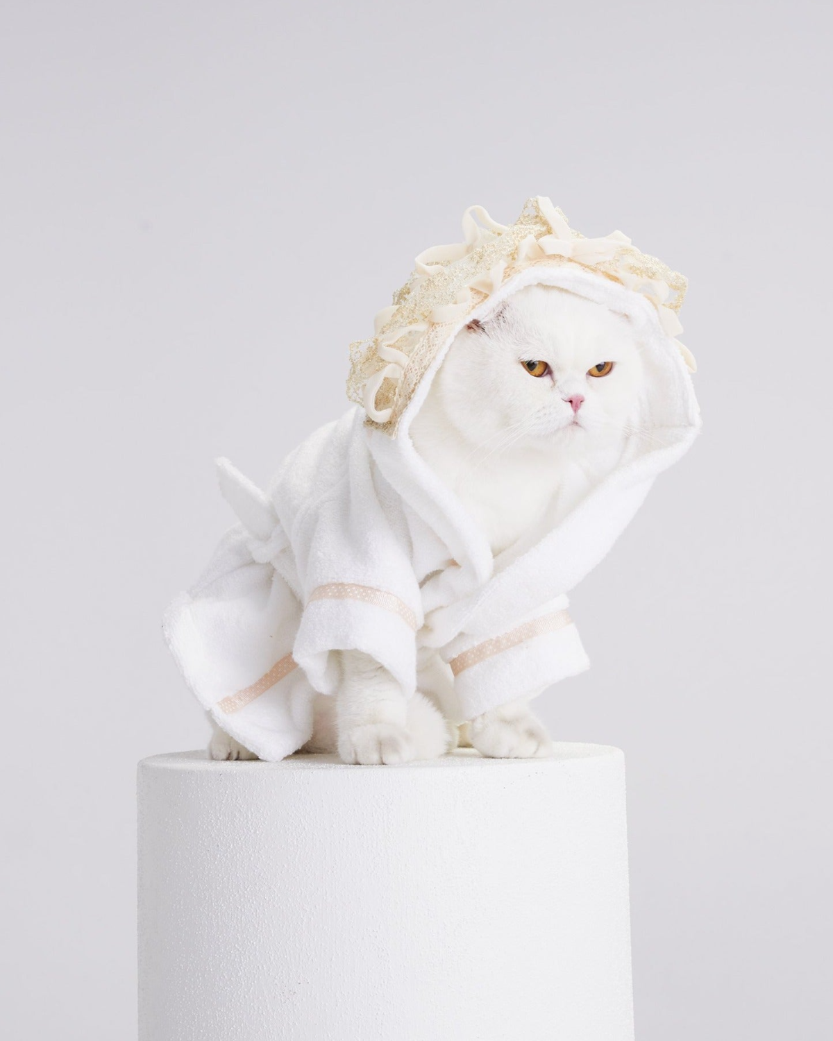 Treat your furry royalty to a spa-like experience with Moshiqa's Principessa Bathrobe! Inspired by fairy tales, this luxurious kimono-style bathrobe features a full ruffle lace hood, satin ribbon accents, and a soft belt. Crafted from absorbent, natural cotton toweling, it dries your pet quickly and leaves them feeling like a princess.