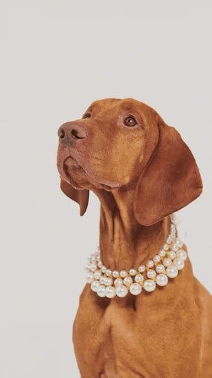 This dog necklace is the absolute statement piece for chic wardrobes. The refined design combines three rows of luxurious pearls and crafted gold components. The silky ribbon for the closure makes the necklace so soft and comfortable for the fur babies.